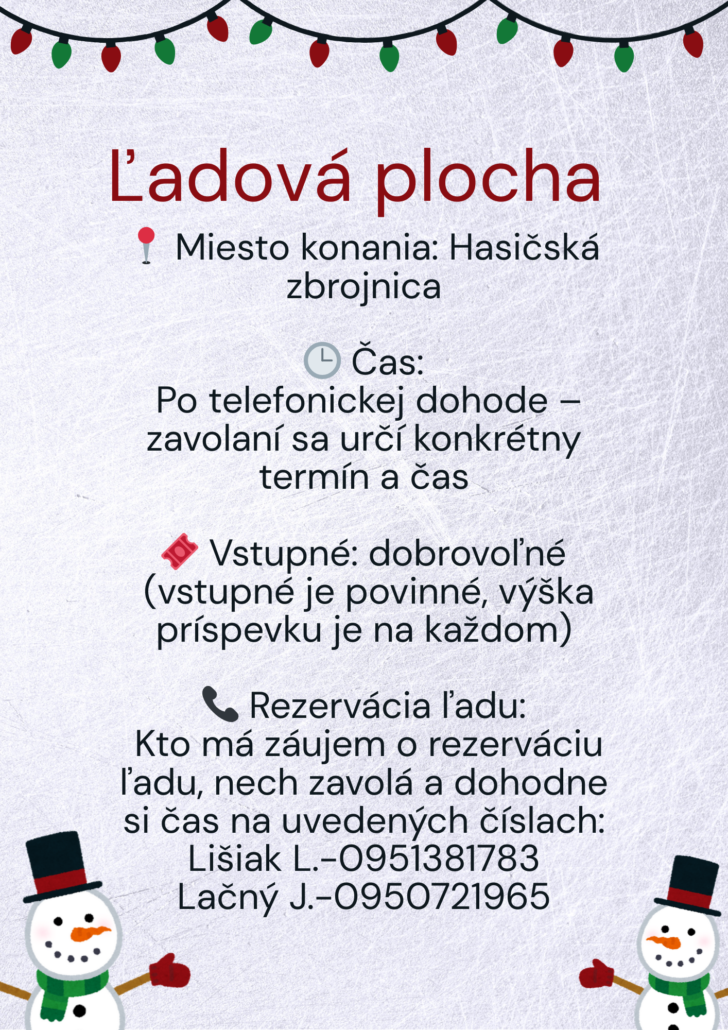Členovia DHZ Gánovce pripravili ľadovú plochu na časti multifunkčného ihriska v areáli hasičskej zbrojnice. Viac informácií na priloženom plagáte.