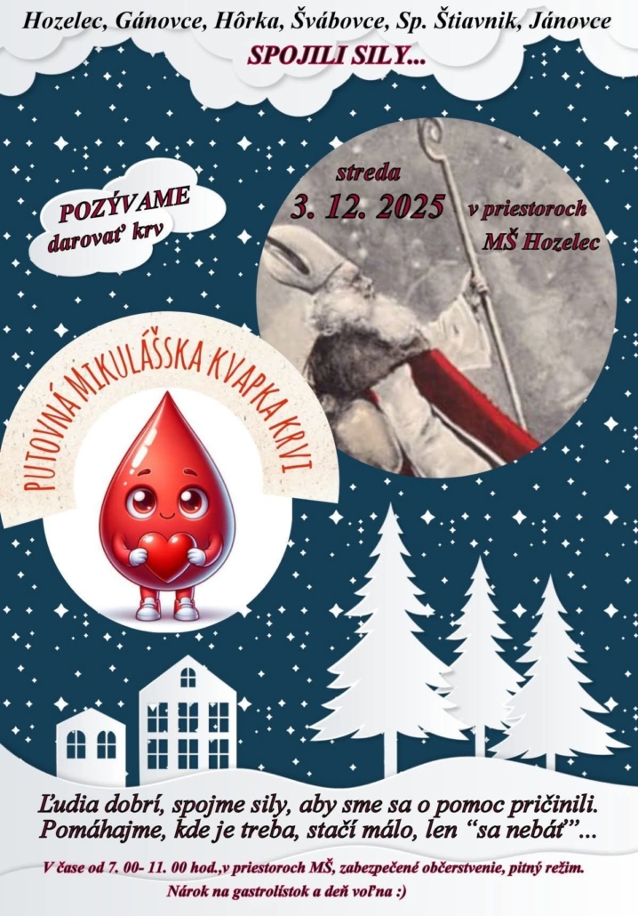 Povzbudzujeme občanov, aby sa Putovnej Mikulášskej kvapky krvi zúčastnili a podporili dobrú vec.